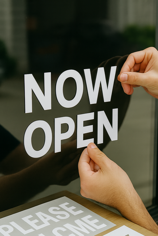 Professional cut vinyl lettering for windows, walls, and vehicles. Clean, bold, and weather-resistant — perfect for logos, hours of operation, and custom designs.