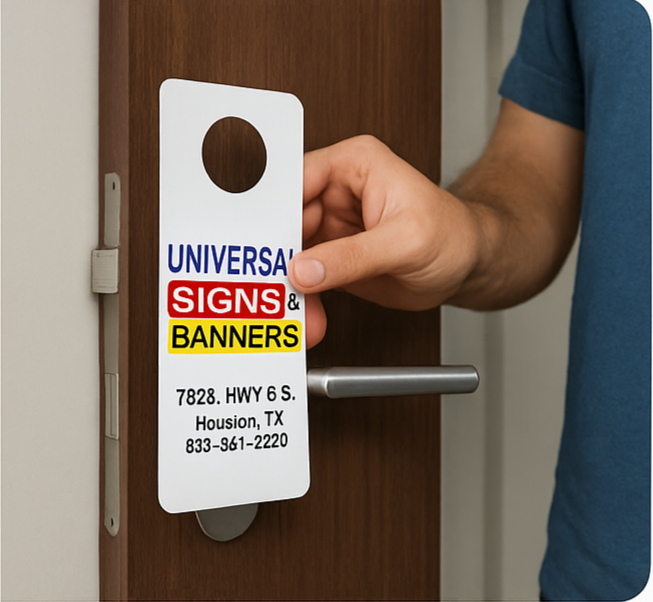 Stand out in your local neighborhood with custom door hangers. Durable, full-color prints designed to grab attention and deliver your message directly to your audience.